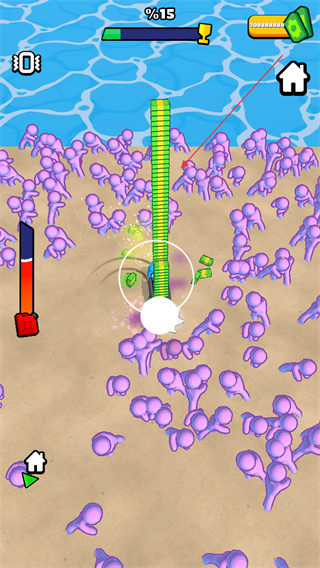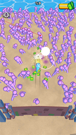 2、当接近僵尸群时,利用收割机的攻击机制,对周围的紫色僵尸发动攻击,玩家进行收割僵尸,获取金币和其他资源。