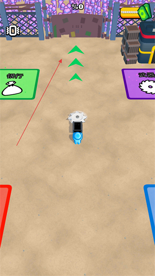 1、游戏开始后操控僵尸收割机向前移动,沿着绿色箭头指示的方向前进,进入僵尸聚集区域,准备开始收割僵尸。