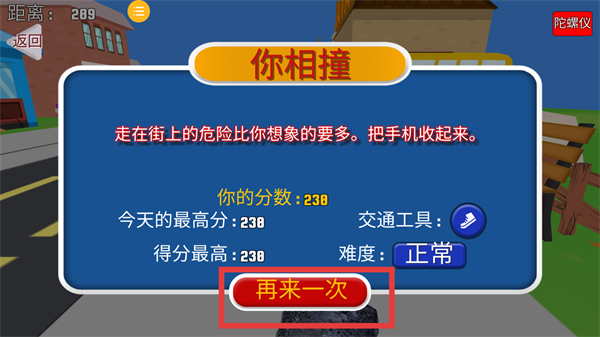4、如果发生碰撞,游戏会结束并显示分数等信息,此时可以点击再来一次按钮,重新开始跑酷挑战。