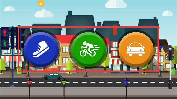 2、在交通工具选择界面,有步行骑自行车图标等三种交通工具可供选择,挑选一种交通工具,进入城市街道的跑酷场景。