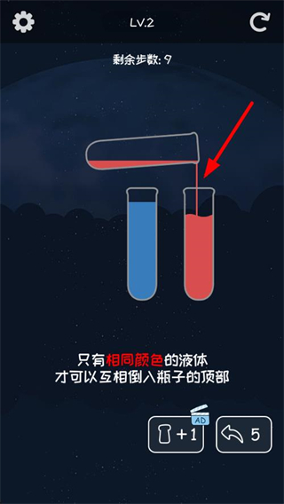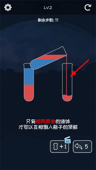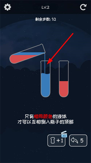 2、持续将同色液体倒入匹配的容器,逐步完成液体的分类整理,消耗剩余步数推进关卡进度。