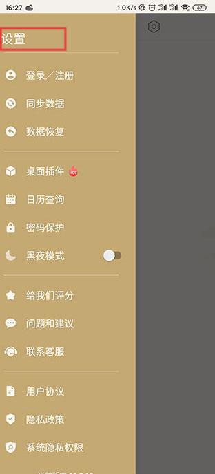 2、点击左上角的符号能够打来设置功能,其中有着登入注册、同步数据、卓面插件、日历查询、密码保护、黑夜模式等工具。