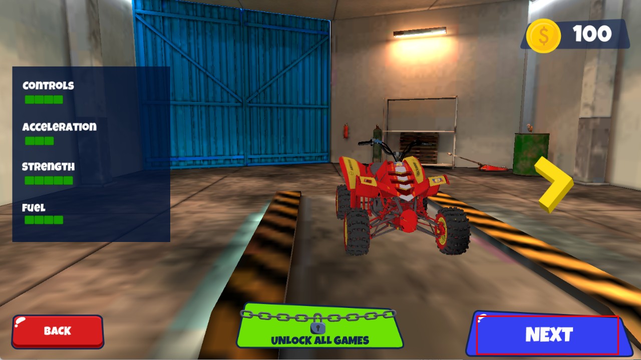 2、在摩托展示界面,可查看摩托的操控、加速、强度、燃油等属性,点击蓝色“NEXT”按钮,进入驾驶场景。