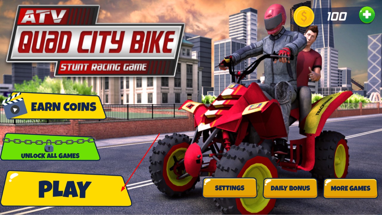 1、进入游戏界面,点击PLAY按钮,即可开始游戏,开启四轮摩托城市特技竞速之旅。