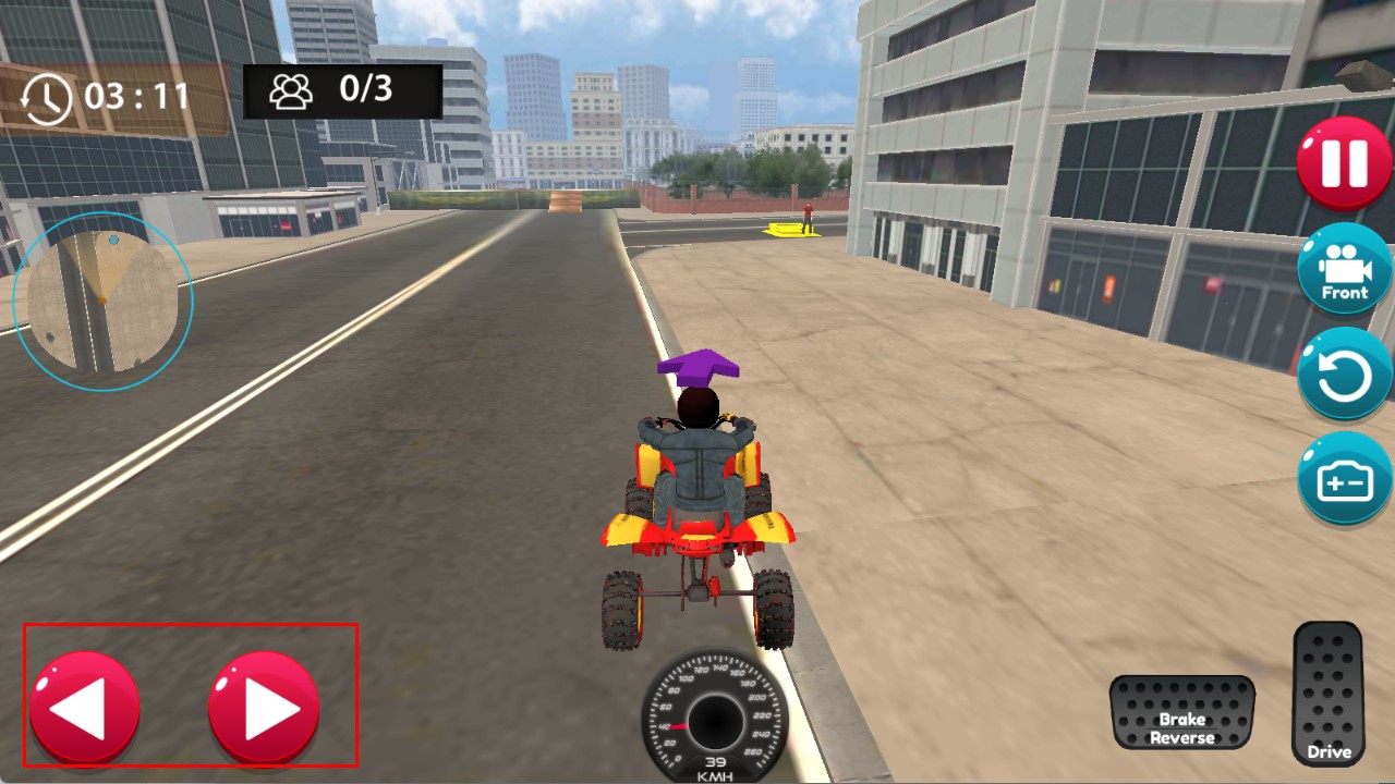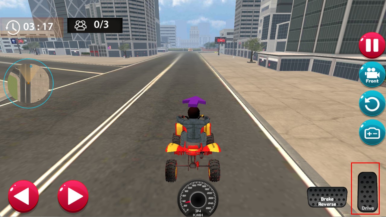 3、驾驶时,点击右侧Drive按钮,可操控四轮摩托在城市街道上行驶,开始特技竞速挑战。