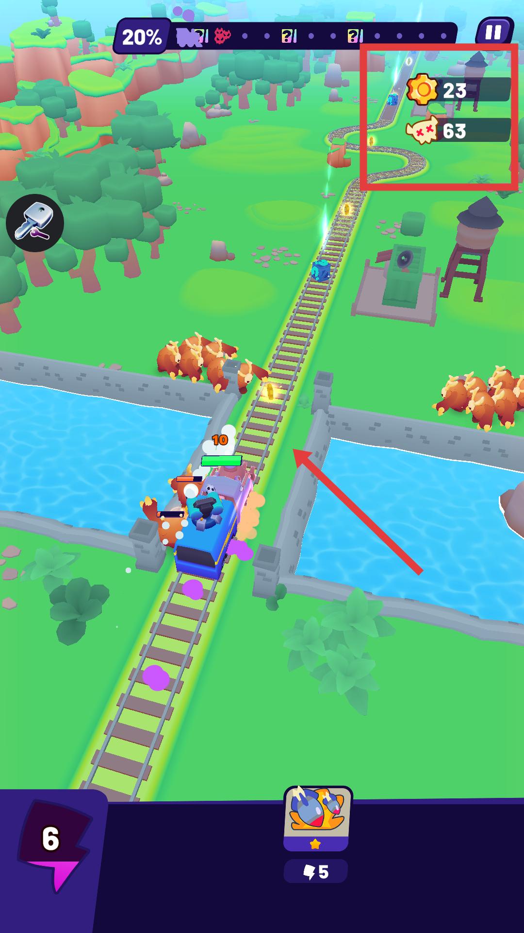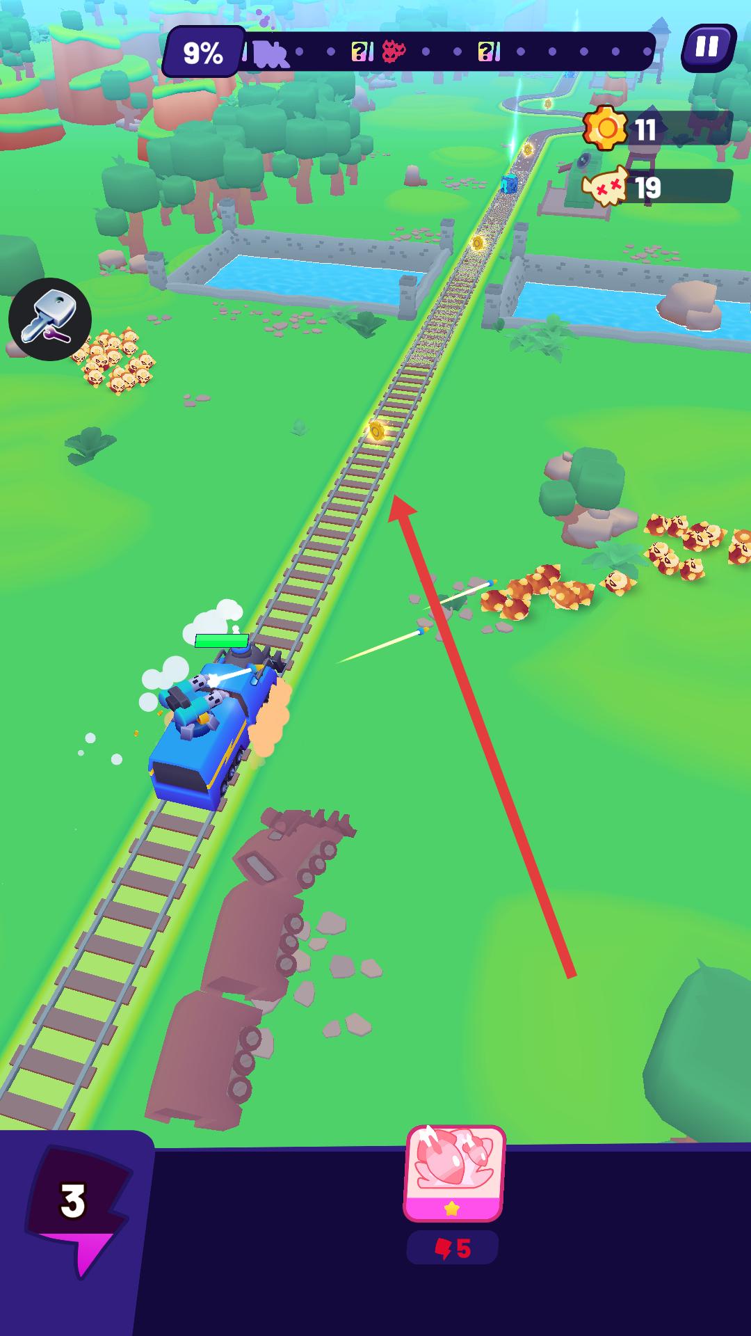 3、选好车厢后进入游戏场景,操控火车在铁轨上行驶,看到铁轨上有金币,引导火车向金币方向移动,同时注意躲避或射击沿途出现的敌人。