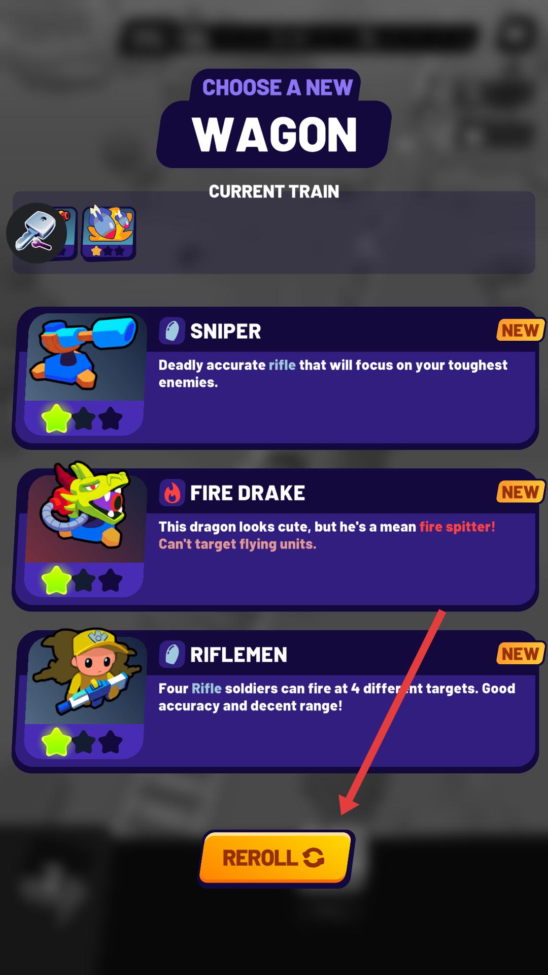 2、在车厢选择界面若对当前展示的车厢不满意,可点击REROLL按钮,重新刷新可选的车厢,挑选更合适的车厢来增强火车的战斗能力。