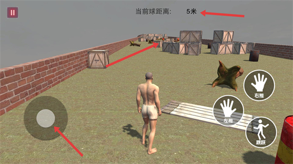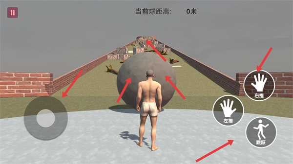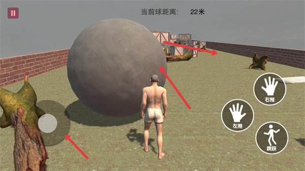 2、操控角色在有砖块围墙的场景里,利用左推、右推、跳跃等操作,推动大石球前进。