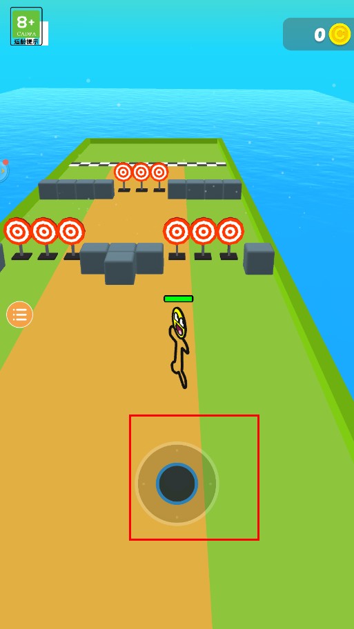 3、操控火柴人在赛道上前进利用屏幕下方的虚拟摇杆控制火柴人的移动方向,躲避障碍物,尽量击中赛道上的标靶。