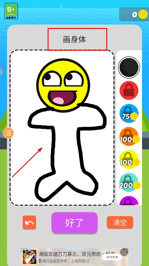 2、进入绘制环节,按照画身体的提示,在指定区域用手指或画笔工具勾勒火柴人的身体轮廓,绘制完成后点击好了按钮 。