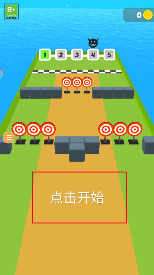 1、进入游戏界面,看到赛道及标靶等元素,点击下方点击开始按钮,就能开启充满趣味的火柴人冒险之旅。