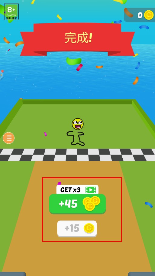 4、成功抵达终点显示完成后,会有金币奖励,选择带有广告标识的GET x3 +45金币按钮,可获得更多金币,然后可继续挑战后续关卡。