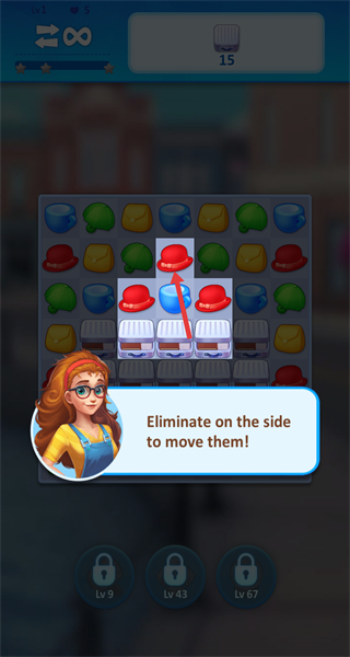 2、通过消除侧边的物品,可让相关物品移动,利用这一规则,创造有利的消除和移动条件,推进游戏进程。