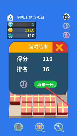 4、游戏结束后,会显示得分和排名,若想继续玩,点击再来一局,重新开启游戏,继续挑战,争取更好成绩。