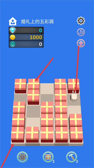 1、看到布满红色礼盒的界面,操控角色移动,准备开启礼盒,收集里面的物品,积累资源。